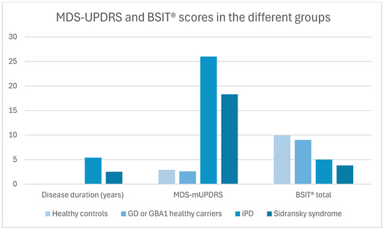 Disease duration, MDS-mUPDRS, and BSIT in the different groups. Abbreviations: MDS-mUPDRS= Movement Disorders Society motor part of the Unified Parkinson’s Disease Rating Scale; BSIT® = Brief Smell Identification Test; GD = Gaucher disease; GBA1 = glucocerebrosidase type 1; and iPD = idiopathic Parkinson’s disease.