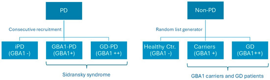 Recruitment of patients and controls of the study. Abbreviation: GD = Gaucher disease; GBA1 = glucocerebrosidase type 1; PD = Parkinson’s disease; iPD = idiopathic Parkinson’s disease; and Ctr. = control.