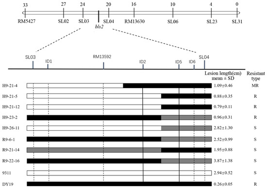 Genotyping of randomly selected BC5F2 plants was performed using molecular markers ID2 and ID5 (Figure 2), and the lesion length of the plants was investigated. The consistency rate between marker genotypes and resistance phenotypes to BLS was calculated in Table 2.