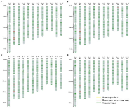 In traditional breeding, constructing near-isogenic lines (NILs) with high background recovery rates requires at least four to five backcrossing generations. However, for NILs carrying homozygous recessive genes, eight to ten generations of backcrossing and selfing are typically recommended [18]. Tanksley and McCouch [29] demonstrated that using MAS, a high background recovery rate can be achieved after just three backcrosses. Ellur et al. [30] and Sagar et al. [31] showed that by combining strict phenotypic selection with marker-assisted background selection, NILs of PB1121 and PB6 with high background recovery rates could be obtained after three backcrosses. Pu et al. [32] utilized MAS to obtain Chinese cabbage NILs resistant to clubroot disease (CRb) after three backcrosses.