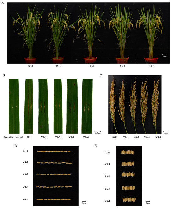 The four resistant lines exhibited significantly shorter lesion lengths than 9311 following GX01 inoculation at the tillering stage (Figure 4B). In terms of agronomic traits, there were no significant differences between the resistant strains Y9-1, Y9-2, Y9-3, Y9-4 and 9311 in plant height, number of effective panicles, panicle length, seed setting rate, grain length, grain width, length-to-width ratio, and 1000-grain weight (Figure 4A,C–E and Table 4).