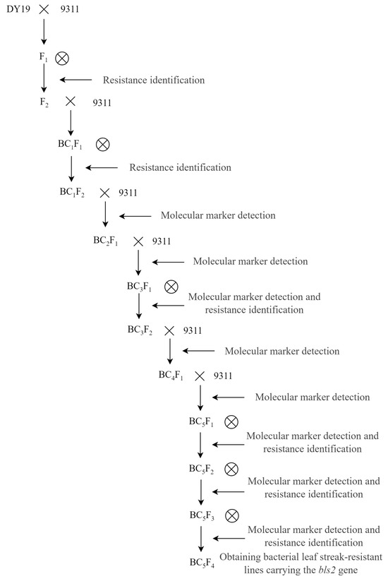 DY19, a Guangxi common wild rice accession resistant to BLS, and 9311, a highly BLS-susceptible indica rice variety were used as experimental materials. The donor parent DY19 was crossed with the recipient parent 9311, followed by selfing. BLS-resistant F2 plants were selected through resistance inoculation identification and then backcrossed with 9311, followed by selfing to obtain the BC1F2 population. From this population, BLS-resistant plants were selected through resistance identification and backcrossed with 9311 again. Meanwhile, molecular markers obtained from bls2 mapping were used to screen plants in each subsequent generation. After every two consecutive backcrosses, one selfing was performed, and resistance inoculation assays were conducted in each selfing generation. This process continued until the BC5F2 generation, where plants carrying the homozygous resistant marker genotypes with significantly enhanced BLS resistance and agronomic traits similar to those of 9311 were selected. These plants were then selfing twice to obtain stable lines. The process of developing the resistant lines is illustrated in Figure 5.