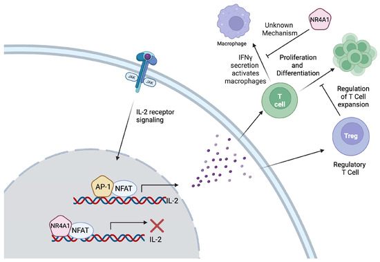 Due to its structural similarity to activator protein-1 (AP-1), NR4A1 competes with AP-1 for binding to AP-1 cis elements, leading to the inhibition of interleukin-2 (IL-2) expression. The production of IL-2 activates both Tregs and T cells. T cell proliferation and differentiation is regulated by regulatory T cells (Tregs); thus, the tight regulation of IL-2 maintains the homeostatic balance. T cells can secrete interferon gamma (IFN-γ) to activate antigen presentation by macrophages, a process that is inhibited by NR4A1, affecting the immune response. However, the mechanistic link between NR4A1 and IFN-γ has not been discovered.