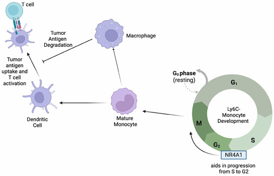 NR4A1 has previously been shown to be highly expressed in patrolling monocytes and is essential for their survival [10]. Indeed, mice lacking NR4A1 do not have patrolling monocytes [10]. The depletion of NR4A1 led to the arrest of patrolling monocytes within the S and G2 cell cycle phases; therefore, they were unable to proliferate and differentiate (Figure 2) [10]. Furthermore, the depletion of NR4A1 was correlated with a lower expression of CX3CR1, CCAAT enhancer binding protein beta (C/EBP-β), and JunB, three essential proteins for patrolling monocyte differentiation, resulting in the dysregulation of their development and differentiation [10]. Additionally, the NF-κB signaling pathway was upregulated in NR4A1-depleted mice in patrolling monocytes, leading to the potentiation of their inflammatory phenotype [10]. Hanna RN et al. found that the loss of patrolling monocytes in NR4A1-deficient mice led to increased lung metastasis [11]. The transfer of NR4A1-positive patrolling monocytes into these mice resulted in reduced metastasis via the removal of tumor cells from the lung vasculature and the recruitment of natural killer cells [11]. A follow-up study from the same lab showed that NR4A1 expression in patrolling monocytes was dependent on an enhancer within the NR4A1 promoter that binds to Krüppel-like factors (KLFs) transcription factors [12]. The deletion of this enhancer resulted in the loss of patrolling monocytes and increased metastasis while maintaining NR4A1 expression in macrophages [12]. These data indicate that NR4A1 is required for the differentiation and survival of patrolling monocytes, which may be important for tumor immunosurveillance.