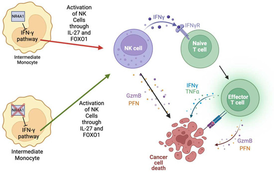 NR4A1 inhibits the IFN-γ pathway within intermediate monocytes, blocking the activation of NK cells via IL-27 and FOXO1. NK cells can directly kill tumor cells by releasing granzyme B and perforin or by activating T cells via IFN-γ secretion. Thus, activated T cells can further augment cancer cell death.
