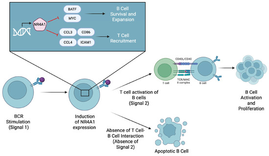 The expression of NR4A1 is induced after B cell receptor (BCR) stimulation by an antigen. NR4A1 then represses BATF and MYC to limit B cell survival and expansion. It also inhibits the expression of CCL3, CCL4, and CD86, which are required for T cell recruitment and co-stimulation. If B cells do not receive timely T cell help, they undergo apoptosis.