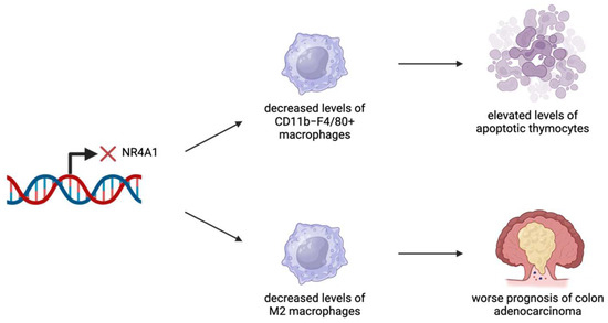 Macrophages are vital for the regulation and operation of the immune system [57]. Macrophages undergo polarization to different states depending on the cellular context, with M1-like and M2-like macrophages representing the most commonly used nomenclature to describe macrophage polarization [57]. Studies have shown that M1-like and M2-like macrophages have opposing effects within the TME [58]. M1 macrophages are pro-inflammatory in nature and assist in antigen presentation to activate other parts of the immune system [59]. In contrast, M2 macrophages are anti-inflammatory and are poor antigen presenters, causing them to have immunosuppressive effects [58]. A few studies have found a role for NR4A1 in macrophages related to both their physiological and pathological functions in cancer. CD11b−F4/80+ macrophage cells in the thymus are responsible for degrading apoptotic thymocytes [15]. Mice lacking the expression of NR4A1 transcription factors (Nr4a1−/−) were unable to develop an adequate level of macrophages to carry out this process, demonstrating the importance of NR4A1 (Figure 5) [15]. Furthermore, NR4A1-deficient mice were shown to experience an “accelerated thymic demise” and an increase in the production of pro-inflammatory cytokines [15]. Combined with an elevated production of anti-nuclear antibodies in Nr4a1−/− mice, there is a possibility that macrophages relying on NR4A1 play an important role in thymic homeostasis [15].