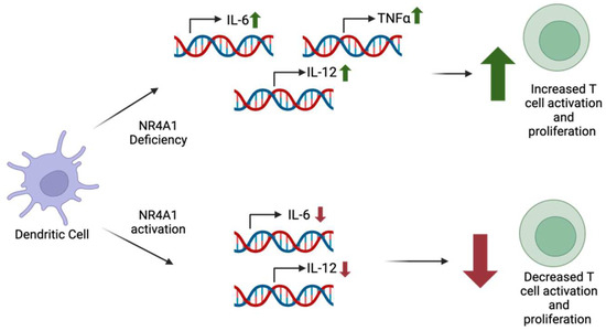 NR4A1 deficiency within dendritic cells has been correlated with increased levels of pro-inflammatory cytokines IL-6, IL-12, and TNF-α. The cytokine levels positively correlate with T cell activation and proliferation. However, NR4A1 in dendritic cells was seen to decrease IL-6 and IL-12 production, leading to decreased T cell activation and proliferation.
