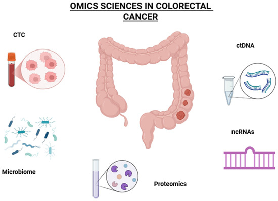 Omics sciences in colorectal cancer. CTC: circulating tumor cells; ctDNA: circulating tumor DNA; ncRNAs: non-coding RNAs. The figure was created by BioRender online software (BioRender.com accessed on 7 May 2025).
