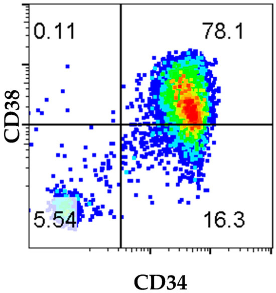 MPB-CD34+ day 0 phenotype. The purity of isolated cells from the mobilized peripheral blood (MPB) was assessed by flow cytometry, demonstrating a highly purified population of CD34+ hematopoietic stem cells (HSC). Assessment of primitive progenitors via flow cytometry for CD34 and CD38 indicated that CD34+CD38− primitive cells were less frequent than the CD34+CD38+ population (16.3 vs. 78.1%).