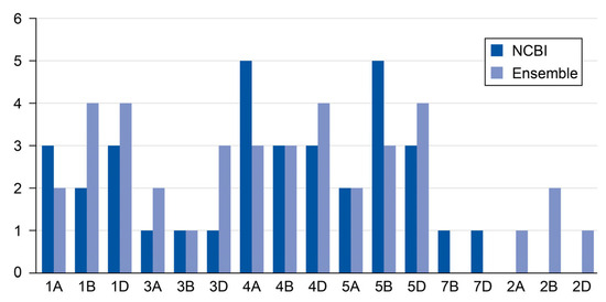 The NCBI database contained 35 genes distributed across different chromosomes, while the Ensembl database contained 38 genes, and both databases indicated the locations of these genes. Figure 1 shows that A, B, and D genomes have different numbers of chromosomes. There were no 2A, 2B, and 2D genomes in the NCBI databases, whereas the Ensembl database contained one gene in both genomes 2A and 2D and two genes in the 2B genome. Some genomes had more genes than other genes. For example, genomes 4A and 5B had five genes from the NCBI database, while genomes 1B, 1D, 4D, and 5D had four genes in the Ensembl database. These gene differences originated from key factors such as the accumulation of genetic differences over time, repeated sequences due to transposable elements (TEs) that could be placed in different locations, gene losses of approximately 10 to 16 thousand genes (as shown in several reports), and the hybridization of wheat from breeding programs [11].