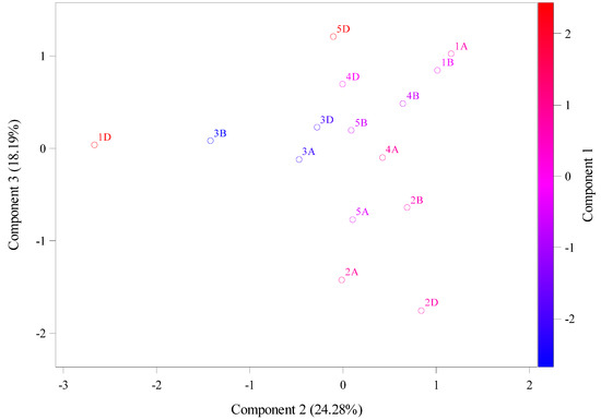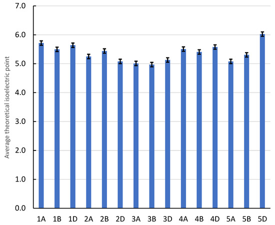 Table 1 shows the result values of molecular weight (g/mol), theoretical isoelectric point, instability index, aliphatic index, and hydrophobicity. Theoretical isoelectric point (PI) is the pH that ranged from 4.81 to 6.6 in chromosomes 3A and 4D, respectively (average 5.37 ± 0.297 Figure 3). However, the instability index showed that these two chromosomes (3A and 4D) were at 34.3 and 38.16, respectively. In addition, these two chromosomes (3A, 4D) had aliphatic index values of 88.69 and 89.59, indicating an increase in their stability, and their hydrophobicity values were lower, at 0.04 and −0.04, respectively. This high instability was found in 1D and 5D, with values of 54.16 and 50.36, respectively, indicating a decrease in their stability as shown by aliphatic index values of 92.98 and 88.91. Figure 4 shows data from the principal component analysis (PCA) for amino acid patterns. From this figure, amino acids that explained the main variation are shown to be assigned to first principal component (PC1) analysis, with a total variation of about 58.88%, and these chromosomes are 5D, 4D, 1A, 4B, 3D, etc. The second principal component (PC2) and third principal component (PC3) analyses had total variations of 27.52% and 13.6%, respectively, assigned to 1D, 3B, 3A, 2D, 2A, and 2B.