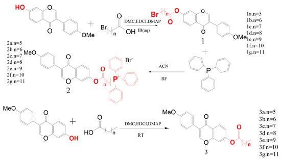 First, 40 mg of formononetin was placed in a reaction vial containing 15 mL of dichloromethane. The corresponding bromo-acid (6-bromohexanoic~12-bromododecanoic acid), EDCI, and DMAP were added in a molar ratio (formononetin: bromo-acid: EDCI: DMAP = 1:2.5:5:2) and allowed to dissolve completely in dichloromethane. The reaction was kept at 0 °C for 7–10 h. TLC confirmed that the reaction was complete. The solvent was recovered under reduced pressure, and the clarified solution became white crystals. Purification was performed by silica gel column chromatography (wet column loading, dry sampling). Separation conditions were as follows: petroleum ether (60–90 °C): acetone = 10:1–14:1. The collected eluate was detected by TLC, and then the target solvent was recovered under reduced pressure to obtain intermediates of different chain lengths (1a~1g). The intermediates (1a~1g) were separately placed in a reaction vial containing 15 mL of acetonitrile to add triphenylphosphine according to the molar ratio (intermediate: triphenylphosphine = 1:3). They underwent reflow in acetonitrile for 40–48 h. The reaction was confirmed to be complete by TLC, after which the clarified solution was obtained. The solvent was recovered under reduced pressure, and the clarified solution was crystallized. Separation and purification were performed via silica gel chromatography (column wet loading, sample wet loading). Separation conditions were as follows: trichloromethane: methanol = 10:1. Then, we performed TLC detection of the collected eluent and the substitution of triphenylphosphine for bromine on the alkyl chain to obtain the final product (2a~2g).
