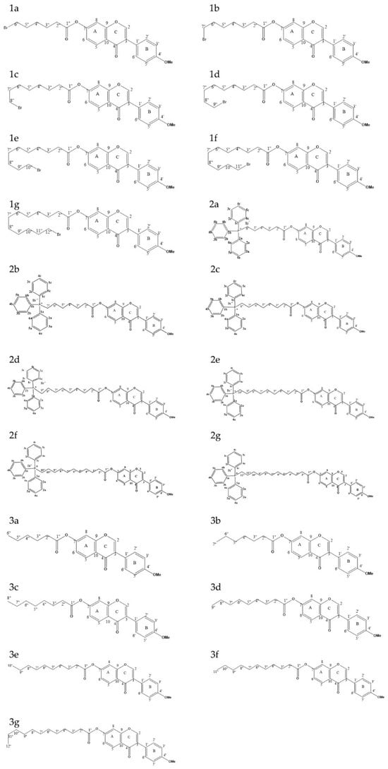 Seven alkyl chains of varying lengths were selected as linkers for chemical synthesis (Figure 1). The synthesized compounds, 1a~1g, 2a~2g, and 3a~3g, were characterized and confirmed using 1H-NMR and 13C-NMR spectroscopy (Figure 2).