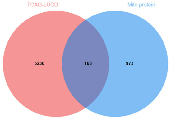 A total of 5395 differentially expressed genes (DEGs) between lung adenocarcinoma samples and normal controls were retrieved from the TCGA database. A volcano plot was generated using the “Ggplot2” package to visualize these DEGs (Figure 3). In the plot, each dot represents a gene: red indicates upregulation genes, blue denotes downregulation genes, and gray corresponds to genes without statistically significant changes. Notably, the number of upregulation genes substantially exceeded that of downregulation genes. Subsequently, 5393 tumor-related DEGs were intersected with a set of 1136 mitochondrial protein-coding genes using a Venn diagram analysis. This resulted in the identification of 163 differentially expressed mitochondrial genes in lung cancer (Figure 4).