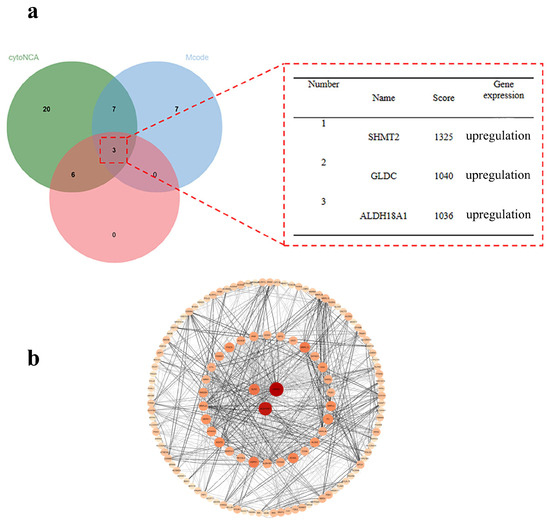 The 163 overlapping DEGs were screened using three analytical methods—CytoNCA, Mcode, and Cytohubba—based on data from STRING database. As shown in Figure 6, the three methods identify the top three hub genes, SHMT2, GLDC, and ALDH18A1, with scores of 1325, 1040, and 1036, respectively, all of which were upregulated in that order. The PPI network illustrated the interactions between 163 genes and ranked them according to their degree values. In the figure, node size and color intensity correspond to degree values: the larger and darker the nodes, the higher the degree value. Genes with higher degree values are considered more likely to be core targets. Therefore, SHMT2, the top-ranked core gene, was selected for molecular docking prediction analysis.