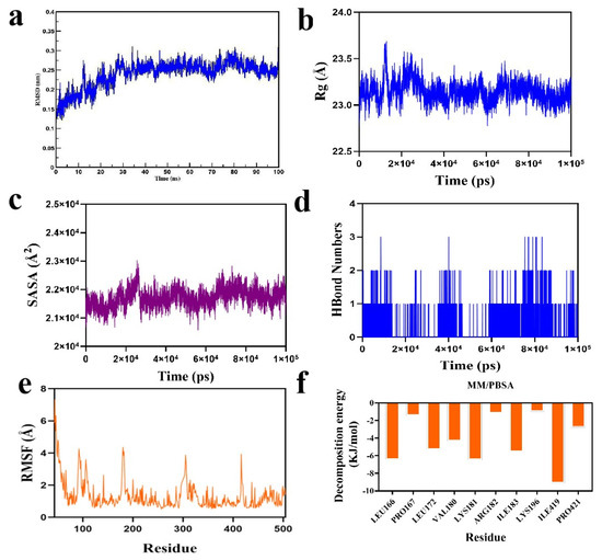 As shown in Figure 8a, the complex system reached equilibrium after 20 ns and subsequently fluctuated around 2.6 Å, indicating that the small molecule exhibits high stability upon binding to the target protein. Further analysis revealed that the radius of gyration (Rg) values of the complex systems in Figure 8b,c showed only slight fluctuations, along with the solvent-accessible surface area (SASA) during the simulation. This indicates that the protein-small molecule complexes underwent minor conformational changes over time. The number of hydrogen bonds formed between the small molecules and the target proteins during the simulation is shown in Figure 8d; typically, the complexes have two hydrogen bonds, with the overall range varying from 0 to 3, indicating that the protein–ligand complexes exhibited favorable hydrogen bonding interactions. As shown in Figure 8e, the root mean square fluctuation (RMSF) values of the complex system components were relatively low (mostly below 4 Å), suggesting limited flexibility and enhanced structural stability.