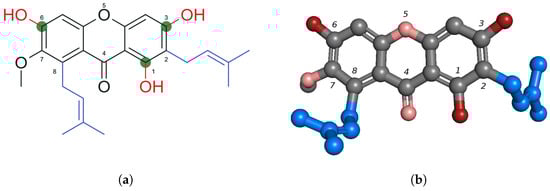 Comparison of 2D and 3D structures of -mangostin (-MG) with atom numbering according to IUPAC convention: (a) 2D chemical structure of -MG with key functional groups: hydroxyl groups (red), hydrogen bonding sites (green), hydrophobic prenyl chains (blue). Image prepared by the authors using MarvinSketch (ChemAxon) based on []. (b) A 3D ball-and-stick representation of -MG, colored by atom type (carbon (gray), oxygen (pink)) and key functional groups (hydroxyl groups (red), hydrophobic prenyl chains (blue)). The structure was visualized in PyMOL.