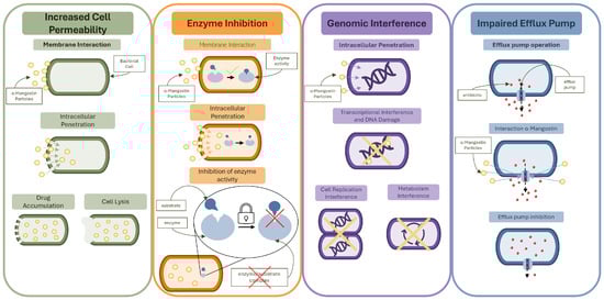 Increased permeability of the cell membrane alters the osmotic balance of the cell, causing external agents, such as water, ions, and drug particles, to penetrate the inside of the cell. This can result in leakage of intracellular matter because of increased internal pressure []. However, another important effect is that external molecules, such as antibiotics, can enter through the permeabilized membrane into the inside of the cell []. This influx bypasses the selective permeability barrier that normally protects the bacterial cell from exogenous threats. As a result, bacterial homeostasis is disrupted, ultimately leading to irreversible cellular damage and death.