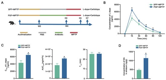 Mouse Experiment 1: Ten male C57BL/6 mice were randomly divided into two groups: SPF + MPTP (n = 5) group was housed in an SPF-level environment and was treated with MPTP by intraperitoneal for 5 days to induce Parkinsonism. PGF + MPTP (n = 5) group received a quadruple-antibiotic cock-tail (1 g/L ampicillin, 1 g/L neomycin, 1 g/L metronidazole, 0.5 g/L vancomycin) in drinking water for 14 days, which was confirmed as >90% microbiota depletion by weekly fecal qPCR and then followed by MPTP treatment for 5 days. On day 7, L-dopa/carbidopa (10/30 mg/kg) was orally gavaged, followed by serial blood sampling (0–120 min) from the posterior orbital venous plexus. Serum separation involved 1 h clotting at 25 °C, centrifugation (3000× g, 15 min, 4 °C), and storage at −80 °C for pharmacokinetic analysis. Experimental timeline and design are detailed in Figure 1A.