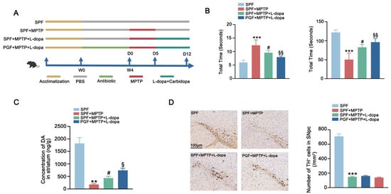 Mouse Experiment 2: Twenty male C57BL/6 mice were randomly assigned to four groups following acclimatization: SPF (n = 5), SPF + MPTP (n = 5), SPF + MPTP + L-dopa (n = 5), and PGF + MPTP + L-dopa (n = 5). Mice in the SPF group were housed in an SPF-level environment and orally administered sterile PBS throughout the experimental period. The SPF + MPTP group received oral administration of sterile PBS from week 1 to week 4, followed by MPTP treatment for 5 consecutive days and subsequent oral administration of sterile PBS for 1 week. The SPF + MPTP + L-dopa group received sterile PBS from week 1 to week 4, followed by MPTP treatment for 5 days and subsequent daily gavage administration of L-dopa/carbidopa (10/30 mg/kg) for 1 week. The PGF + MPTP + L-dopa group underwent a 4-week antibiotic regimen (composition as described in Experiment 1), with weekly fecal qPCR monitoring, followed by MPTP treatment for 5 days. After PD model validation, this group was administered L-dopa/carbidopa (10/30 mg/kg) daily via gavage for 7 days. Following gavage treatment, all groups underwent behavioral tests, including pole climbing and rotarod tests, to evaluate motor function. The experimental design is schematically illustrated in Figure 2A.