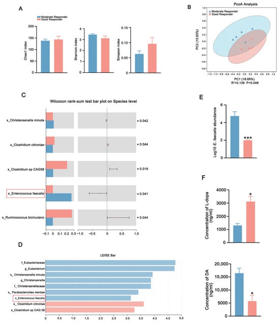 Clinical observations revealed significant interindividual variability in L-dopa responsiveness among PD patients in our previous study [18]. To investigate microbiota-driven pharmacodynamic heterogeneity in PD, five moderate responders and five good responders to L-dopa were enrolled from our previously published L-dopa responsiveness cohort. There were no differences in clinical characteristics, medication dosages, and lifestyle variables (Table S1). The metagenomic sequencing of gut microbiota showed that the Chao1, Shannon, and Simpson indexes did not differ between the two groups, indicating similar fecal microbiota richness and diversity (Figure 3A). However, the principal coordinate analysis (PCoA) score plots revealed distinct clustering patterns, suggesting differences in the composition of gut microbiota between groups (Figure 3B). At the bacterial species level, the abundance of E. faecalis and Christensenella minuta (C. minuta) was significantly higher in moderate responders compared to good responders. Meanwhile, the abundance of Ruminococcus bicirculans (R. bicirculans) and Clostridium citroniae (C. citroniae) was greater in good responders (Figure 3C). Similarly, linear discriminant analysis effect size (LEfSe) revealed that C. minuta, Parabacteroides merdae (P. merdae), and E. faecalis were enriched in moderate responders whereas C. citroniae was enriched in good responders (Figure 3D). Furthermore, quantitative real-time PCR analysis confirmed the increased abundance of E. faecalis in moderate responders (Figure 3E). To confirm the differential capacity metabolization of L-dopa by the feces of two groups, ex vivo fecal fermentation assays demonstrated that the microbiota of moderate responders metabolized L-dopa greatly, associated with excessive DA generation compared to good responders (Figure 3F).