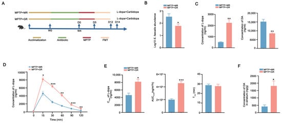 Mouse Experiment 3: A total of 10 matched patients were stratified into moderate responders (<40% UPDRS-III improvement post-dose) and good responders (≥40% UPDRS-III improvement post-dose) according to clinical L-dopa responsiveness detected by L-dopa challenge experiment from our previously published L-dopa responsiveness cohort. All participants were strictly matched for potential confounding factors that could potentially influence L-dopa response, including clinical characteristics, medication dosages, and lifestyle variables. Ten male C57BL/6 mice were randomly divided into MPTP + MR (n = 5) and MPTP + GR (n = 5) groups and established using fecal donors from moderate responders and good responders. Following 28-day antibiotic-induced PGF status, all mice received MPTP neurotoxin (30 mg/kg/day ×5, i.p.). PD model validation preceded daily FMT administration (200 μL/dose) for 7 days using donor stools from moderate- or good-L-dopa responders. Post FMT, mice received oral L-dopa/carbidopa (10/30 mg/kg) with serial retro-orbital blood sampling (50 μL/timepoint) at 0–120 min intervals. Serum processing involved 30 min clotting at 25 °C, centrifugation (3000× g, 15 min, 4 °C), and storage at −80 °C for pharmacokinetic profiling. Experimental workflow is detailed in Figure 4A.