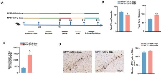 Mouse Experiment 4: Ten male C57BL/6 mice were randomly divided into MPTP + MR + L-dopa (n = 5) and MPTP + GR + L-dopa (n = 5) groups. Following 28-day antibiotic-induced PGF status and MPTP neurotoxin administration (30 mg/kg/day ×5, i.p.), mice received donor-matched FMT via oral gavage (200 μL/day ×7) using fecal samples from PD patients stratified by L-dopa responsiveness. All the group were administered L-dopa/carbidopa (10/30 mg/kg/day ×7) after FMT with motor function assessed 24 h post-final dose via pole test and rotarod test. The experimental schematic diagram is presented in Figure 5A.