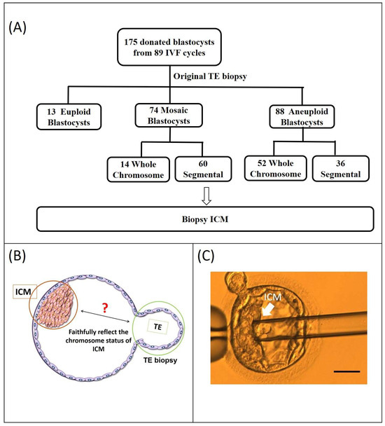 Study flowchart. (A) A total of 175 blastocysts were donated by 89 couples. The original PGT-A results of the donated blastocysts are displayed in the second row. PGT-A results from the original trophectoderm (TE) biopsy indicated 13 euploid, 74 mosaic, and 88 aneuploid blastocysts. Of the 74 mosaic blastocysts, 14 exhibited whole-chromosome mosaicism, while 60 displayed segmental mosaicism; of the 88 aneuploid blastocysts, 52 showed whole-chromosome aneuploidy, and 36 exhibited Seg-A. Chromosome status of mosaic and aneuploidy blastocysts is displayed in the third row. (B) The location of the ICM re-biopsy and initial clinical TE biopsy sites (ICM: inner cell mass; TE: trophectoderm). (C) Isolation of the ICM from a blastocyst. The blastocyst is positioned for micromanipulation. The ICM, marked by the arrow, is targeted for isolation and then aspirated into the micropipette, demonstrating the successful extraction process. (scale bar = 50 μm)
