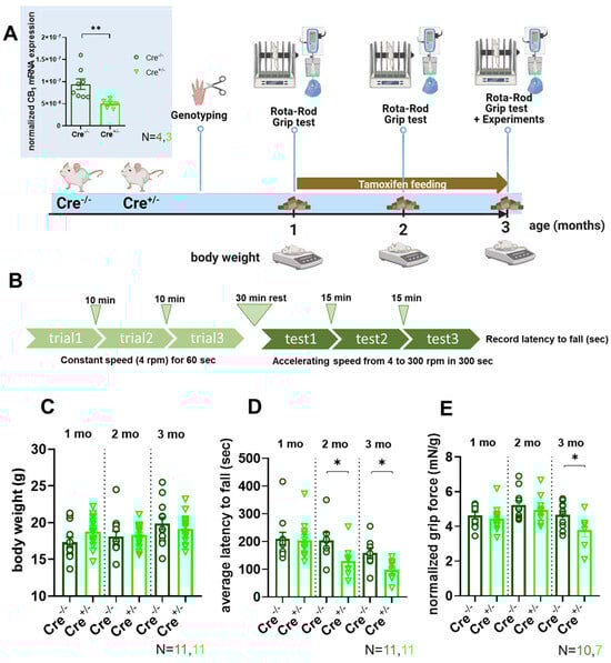 To induce CB1 ablation, a tamoxifen diet (per os) was started immediately after the separation of the Cre+/− and Cre−/− pups from the mother at the age of 4 weeks. Littermates were fed for 2 months without interruption (while monitoring normal body weight gain and performing grip strength and Rota-Rod tests; see Figure 1A) and then were used for the subsequent experiments. The tamoxifen-supplemented chow (Envigo, TD 130857) contained 500 mg tamoxifen/kg, providing 80 mg tamoxifen/kg body weight per day, assuming 20–25 g body weight and 3–4 g daily food intake.