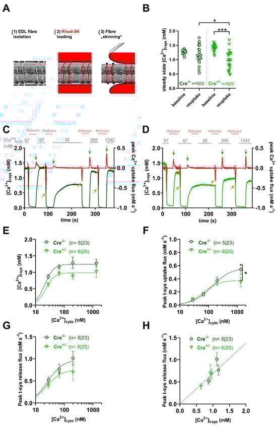 Here, we sought to investigate SOCE using the skinned fiber technique [], which allows high-resolution measurement of t-system membrane Ca2+ fluxes, including SOCE [,]. Briefly, the t-tubular system of M. extensor digitorum longus (EDL) fibers from Cre−/− and Cre+/− mice was loaded with the low-affinity Ca2+-sensitive dye Rhod-5N before fiber skinning (Figure 2A). Calibrated measurement of Rhod-5N fluorescence from within the t-tubular system revealed a slight but significant difference in steady-state t-system Ca2+ ([Ca2+]tsys) under resting conditions when comparing Cre−/− to Cre+/− (compare columns 1 and 3 in Figure 2A). We then induced SOCE by activating the RyR1s via exposure of the fiber to a solution containing nominally 0 mM free Mg2+ and Ca2+, and 30 mM caffeine, respectively. Afterwards, we assessed the reuptake of Ca2+ into the t-system after re-exposing the fiber to a physiological free [Ca2+]cyto of 67 nM. Steady-state Ca2+ levels after re-uptake were smaller compared to respective baseline values for both groups; however, the measured values turned out to be significantly smaller for Cre+/− specimens (Figure 2B, columns 2 and 4). The pharmacological activation of SOCE and concomitant depletion of the t-system is fully reversible, such that the t-system reloads with Ca2+ upon restoration of physiological [Ca2+]cyto and [Mg2+]cyto values []. Such a sequence of depletion and reuptake was repeated at different [Ca2+]cyto concentrations of 28, 67, 200, and 1342 nM for Cre−/− and Cre+/− fibers; original representative traces can be seen in Figure 2C,D, respectively. Evaluating [Ca2+]tsys after re-uptake revealed consistently smaller (albeit non-significant) values in Cre+/− compared to Cre−/− for all Ca2+ concentrations tested (Figure 2E). However, peak t-system uptake flux was not altered under the same conditions (Figure 2F), except for the highest concentration tested. When we evaluated the SOCE flux determined as the peak t-system Ca2+ release flux upon 30 mM caffeine application in zero Ca2+/Mg2+conditions, we noticed a reduction (albeit non-significant) in the absolute values by trend (Figure 2G). The peak t-system fluxes derived in this manner are, however, dependent on the driving force between the t-system and the cytosol. Because [Ca2+]t-sys was reduced in Cre+/− fibers (Figure 2E), we therefore plotted respective flux values over the ambient steady state [Ca2+]t-sys values immediately before depletion. A linear fit to these data is proportional to the t-system Ca2+ permeability and, as such, a relative measure of SOCE. Here, the linear relationship follows from the Goldman–Hodgkin–Katz current equation under the assumption of a sufficiently negative resting membrane potential close to −90 mV and a much larger Ca2+ concentration in the t-system compared to the cytosol [] (see Methods section), two conditions that are readily met in the chosen preparation. When fitting respective data, both Cre−/− and Cre+/− samples showed a good linear correlation but were not different from each other (F-test; p = 0.77).