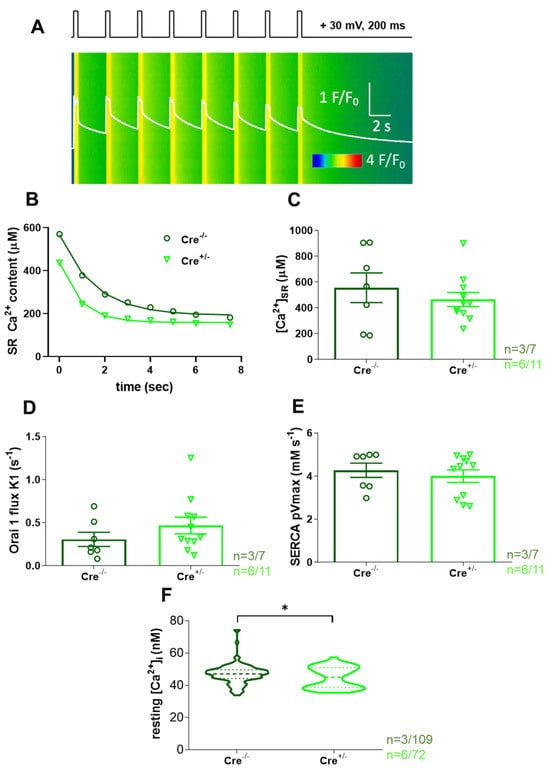 Interestingly, when we measured the resting intracellular calcium concentration ([Ca2+]i) in FDB fibers loaded with the ratiometric dye Fura-2 AM, we found a small but significant reduction in Cre+/− fibers (Figure 3F, 47.1 ± 0.6 nM for Cre−/− vs. 44.9 ± 0.8* nM for Cre+/−, with * p < 0.03).