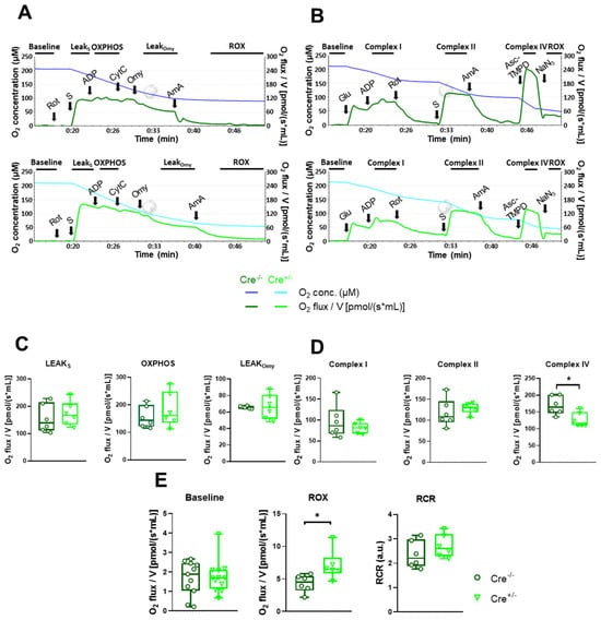 Baseline and ROX were determined using the longer respiration protocol as well, along with OXPHOS linked to complex I and II and complex IV activity (Figure 4B). Among these functional values, only complex IV showed a change, specifically a significant decrease in Cre+/− samples (Figure 4D, 169.7 ± 11.3 pmol/s mL vs. 126.8 ± 8.8* pmol/s mL, * p < 0.01). The respiratory control ratio (RCR) was unchanged (Figure 4E).