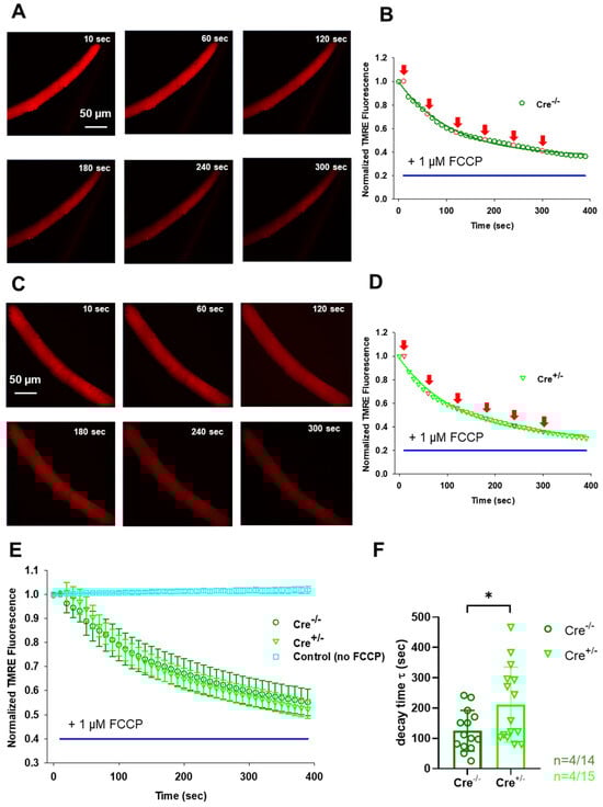 To this end, we loaded single isolated FDB fibers from both strains with 20 nM TMRE—a dye that stains exclusively live mitochondria in the cell. While continuously scanning the fiber of interest with a confocal microscope, we followed the process of ΔΨm dissipation upon the application of 1 µM FCCP, a well-known un-coupler of the electron transport chain (Figure 5A,B for Cre−/− and Figure 5C,D for Cre+/−). Exponential fitting for individual cells (similar to those presented in panels B and D) was used to assess the decay time (τ) for n = 14 Cre−/− and n = 15 Cre+/− cells obtained from 4-4 animals, respectively. The obtained τ values were averaged and plotted for both groups (Figure 5E). Based on the individual exponential fits the average decay times were τ(Cre−/−) = 125.1 ± 17.9 s and τ(Cre+/−) = 211.3 ± 32.1* s, with * p < 0.02; Figure 5F), meaning that the normalized TMRE fluorescence dissipated slower in the Cre+/− fibers. To exclude possible artifacts due to dye bleaching or leakage, we repeated the experiments in the absence of FCCP in 5 control cells from a wild-type C57Bl6 mouse, but essentially no signal loss was detected (Figure 5E, cyan symbols).