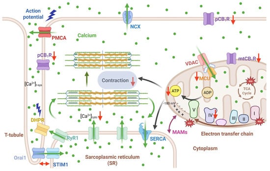 Mitochondrial dysfunction underlies reduced muscle performance in CB1 receptor-deficient mice. Red arrows indicate the changes obtained in our current experiments following tamoxifen-induced muscle-specific CB1 downregulation. Green arrows show the path followed by calcium ions. Briefly, during the ECC mechanism, calcium is released from the SR via the RyR1s and then binds to contractile proteins to induce contraction. SR depletion triggers SOCE activation via Orai1/STIM1 concerted action. Upon muscle relaxation, calcium is returned to the store via the SERCA pumps or sequestered by mitochondria via uptake by the VDAC/MCU proteins. Black arrows indicate the path followed by ATP to induce muscle contraction. Besides calcium, ATP is also critical for muscle contraction, and it underlies SERCA function as well. Abbreviations: pCB1R, plasma membrane cannabinoid receptor type 1; mtCB1R, mitochondrial cannabinoid receptor type 1; DHPR, dihydropyridine receptor; PMCA, plasma membrane calcium ATPase; Orai1, calcium release-activated calcium channel protein 1; STIM1, Stromal interaction molecule 1; RyR1, ryanodine receptor type 1; SERCA, sarco(endo)plasmic reticulum calcium ATPase; NCX, sodium calcium exchanger; ATP, adenosine trisphosphate; ADP, adenosine diphosphate; VDAC, voltage activated anion channel; MCU, mitochondrial calcium uniporter; ROS, reactive oxygen species; TCA, Tricarboxylic acid; MAM, mitochondria-associated membrane. Created in BioRender. Sztretye, M. (2025) https://BioRender.com.