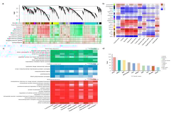 Discovery of MYB genes through WGCNA. (a) Hierarchical cluster tree. Each branch in the gene dendrogram corresponds to a color-coded module. Color rows underneath denote the assigned co-expression modules and heatmap plot of traits. (b) Module-trait correlation heatmap. Each row represents a color-coded module and each column represents a specific flavonoid compound (or total flavonoids). Numbers in each cell represent the module-trait Pearson correlation coefficient and the corresponding p-value (in bracket). Red/blue color represents positive/negative correlation, and the deeper color represents the stronger correlation. (c) Gene Oncology (GO) analysis. Positive correlated genes in the module-trait correlation heatmap were functionally assigned to molecular function, cellular component, and biological process. (d) The top ten WGCNA screened transcription factors (TFs). MYB, v-myb avian myeloblastosis viral oncogene homolog; bHLH, basic helix-loop-helix; ERF, ethylene response factor; MYB-related, contains an intact or partial MYB repeat (1R-MYBs); NAC, contains three conserved domains—petunia no apical meristem (NAM), ATAF1/2, and cup-shaped cotyledon (CUC); WRKY, contains a conserved WRKY (WRKYGQK) domain at the N-terminal end; bZIP, basic leucine zipper; Dof, DNA binding with one finger; HB-other, homeobox (HB) contains a conserved homeodomain (HD) domain; GRAS, GIBBERELLIN-ACID INSENSITIVE (GAI), REPRESSOR of GA1 (RGA), and SCARECROW (SCR), namely, GAI-RGA- and -SCR (GRAS) protein, contains a C-terminal GRAS domain with a highly variable N-terminal region.