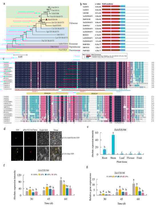 SsMYB106 phylogenetic relationship, R2R3-MYB domain, subcellular localization, and expression pattern. (a) Phylogenetic tree. The neighbor-joining tree was constructed with 1000 bootstraps in the MEGA11 package. The scale bar represents 0.05 amino acid substitutions per site. The number at the nodes indicates bootstrap value. The transcriptional factors’ GeneBank sequence accession numbers in NCBI were: VuODO1, SPEB01002064; VaODO1, CM003371; VrMYB8, JJMO01000123; VuODORANT1, NBOW01000003; SsMYB106, TKY55375; GsODORANT1, QZWG01000017; GmMYBJ1, ACUP04001638; CcODORANT1, AGCT01010269; ApODORANT1, QYUI01000146; MtODO1, CM001220; LaODORANT1, KV862056; PaODORANT1, SMJV01004691; MdMYB54, AUZ96353; DlMYB16, QCH41128; and PsMYB23, QIG55706. (b) Motif discovery. Motif 1 and Motif 2 were two R2R3-MYB motifs containing SANT/myb domains (e.g., PF00249) discovered by MEME (Version 5.5.2). (c) Multiple amino acid sequence alignment by DNAMAN (Version 6.0). The red and blue lines denote two MEME discovered motifs (Strat-end positions of Motifs: Motif 1, 11–50, 54–103; Motif 2, 104–134). The orange lines denote two InterPro (Pfam entry: PF00249) Myb-like DNA-binding domains (Strat-end positions of PF00249: 14–61, 71–111). (d) SsMYB106 subcellular localization in lower epidermal cells of N. benthamiana. YFP, yellow fluorescent protein; pBin-NLS-mCherry, red fluorescent protein fused with nuclear localization signal; Bright field, the transmitted light image; Merge, the transmitted light image overlayed with YFP and mCherry fluorescence image. Scale bar, 75 μm. (e) SsMYB106 tissue-specific gene expression in five tissues of eight-year-old cultivated S. suberectus, quantified by RNA-seq. (f,g) SsMYB106 light-intensity-induced gene expression in stems of two-year-old cultivated S. suberectus, quantified by RNA-seq (f) and RT-qPCR (g). Lower case letters indicate statistically significant differences caused by light intensity (p < 0.05, a > b > c > d).