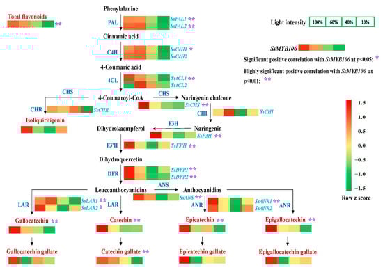 SsMYB106 correlations with flavonoids and biosynthetic genes in light treatments. When two-year-old cultivated S. suberectus was treated with four attenuated sunlight intensities (100%, 60%, 40%, and 10%) for 60 days, fresh stem samples were collected, flavonoids contents were determined, and SsMYB106 gene and 18 flavonoid biosynthetic genes expressions were quantified (RT-qPCR). Then, the Spearman’s rank correlations of SsMYB106 gene expressions with flavonoids contents and with the 18 flavonoid biosynthetic genes were computed. Significant positive correlation at p < 0.05 is marked with a single asterisk (*), and highly significant positive correlation at p < 0.01 is marked with a double-asterisk (**). Abbreviations: PAL, phenylalanine ammonia-lyase; C4H, cinnamate-4-hydroxylase; 4CL, 4-coumaroyl-CoA ligase; CHS, chalcone synthase; CHR, chalcone reductase; CHI, chalcone isomerase; F3H, flavanone 3-hydroxylase; F3′H, flavonoid 3′-hydroxylase; DFR, dihydroflavonol-4-reductase; LAR, leocoanthocyanidin reductase; ANS, anthocyanidin synthase; ANR, anthocyanidin reductase.