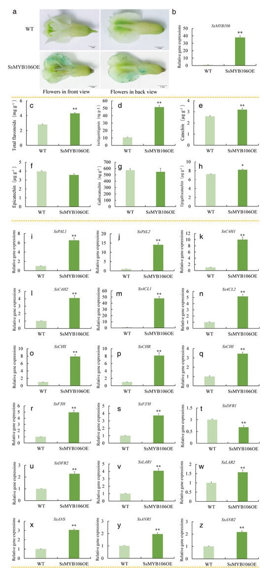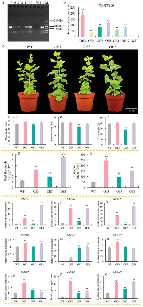 These results demonstrate that SsMYB106 stable overexpression produced two phenotypes, enhanced total flavonoids and catechin contents, and activated (or at least unchanged) all the flavonoid biosynthetic pathway genes expressions in transgenic N. benthamiana.