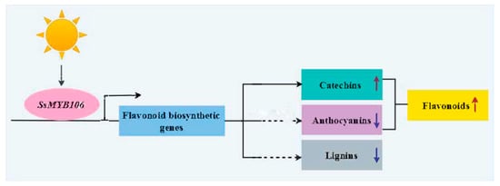 A working model was proposed to illustrate SsMYB106 gene functions (Figure 6). SsMYB106 was in the upstream of the light-regulated flavonoid biosynthetic network, responding to light, and participated in controlling downstream target genes. SsMYB106 overexpression in S. suberectus and in N. benthamiana upregulated the majority of flavonoid pathway genes, promoted flavonoids (especially catechins) biosynthesis, and suppressed anthocyanin biosynthesis. Part of the SsMYB106-overexpressing tobacco lines exhibited phenotypical defect traits relating to reduced lignins, and implied that SsMYB106 overexpression might inhibit lignin biosynthesis.