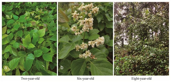 Spatholobus suberectus Dunn was cultivated as described in our previous study []. As flowers and fruits can only be gathered from perennial growers, S. suberectus of different cultivating years were used in this study. Specifically, two-year-old (2019–2020) (Figure 7a), six-year-old (2017–2022) (Figure 7b), and eight-year-old (2010–2017) (Figure 7c) cultivated S. suberectus Dunn plants were used for light treatments, SsMYB106 transient expression, and SsMYB106 tissue-specific gene expression, respectively. In addition, Nicotiana benthamiana Domin was cultivated at 25 °C, 16/8 h (light/dark), and 4500 lux (light intensity) for SsMYB106 subcellular localization and stable genetic transformation.