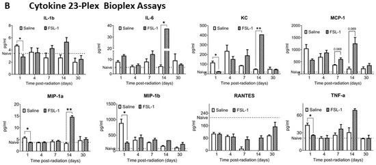 To assess the effect of FSL-1 on inflammatory cytokines/chemokines and growth factors, a Bioplex assay was performed with the serum samples from the same cohort (used for ELISA) using a cytokine 23-plex panel. Serum samples (n = 3) were used for both FSL-1 and saline groups on days 1, 4, 7, 14, and 30 post-radiation (Figure 3B). Our results show significantly increased interleukin-6 (IL-6) (p = 0.003), keratinocyte-derived chemokine (KC) (p < 0.001), and macrophage inflammatory protein 1a (MIP-1a) levels (p < 0.0001) in FSL-1-treated mice compared to the control group 14 days post-radiation. On the contrary, KC (p = 0.0003), IL-1b (p = 0.005), MIP-1a (p = 0.009), MIP-1b (p = 0.008), and tumor necrosis factor (TNF-a) (p = 0.006) showed significantly decreased levels 1 day post-radiation in mice treated with FSL-1 pre-TBI compared to mice treated with saline.