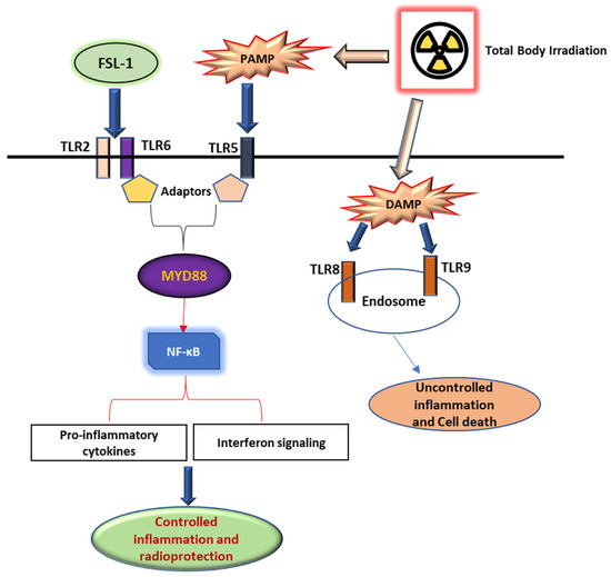 FSL-1 protects against radiation-induced damage through the TLR signaling pathway. FSL-1 given prior to radiation exposure activates the TLR2/6 receptor pathway through Myd88-dependent signaling, thereby enabling controlled pro-inflammatory cytokines and interferon signaling mediated by NF-κB. Conversely, PAMP and DAMP released extracellular and intracellular activate alternate pathways that promote the dysregulation of inflammatory signaling, resulting in cell death and fibrosis.