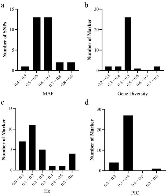Genetics analysis of 32 candidate core markers in 280 eggplant materials. (a) Minor allele frequency (MAF). (b) Gene diversity (GD). (c) Heterozygosity (He). (d) Polymorphic information content (PIC).