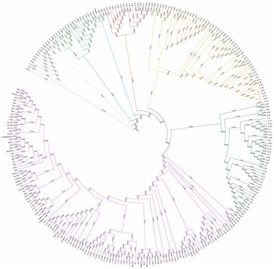Nonetheless, the scope of material collection and the relatively limited number of developed KASP markers impose certain constraints on genetic analysis. Phylogenetic clustering and PCA revealed that a few materials exhibited close kinship, making them challenging to differentiate, with occasional clustering inaccuracies, such as the grouping of H_56 within the wild-type cluster. With the rapid advancement of DNA sequencing and genotyping technologies, the limited marker quantity, stemming from the adoption of the principle of minimum markers for maximum sample discrimination, meant that the genotyping strategy focused on distinguishing the largest number of samples with the fewest markers, which likely led to insufficient marker coverage to capture the unique genetic signatures of certain samples; additionally, potential sample information errors arising from human operational mistakes in handling the large sample volume cannot be ignored. DNA fingerprinting has entered a new era. Early technologies, constrained by high costs and technical limitations, relied on a limited number of markers to differentiate germplasm materials. However, with the maturity of high-throughput sequencing and chip technologies, experimental costs have significantly decreased, and the number of markers is no longer a limiting factor. High-density, multi-site gene chips allow for the rapid screening of numerous samples, greatly enhancing the efficiency and accuracy of germplasm identification. Currently, a single gene chip can detect tens of thousands of genetic loci [40,41], facilitating large-scale testing and providing robust technical support for germplasm innovation and breeding selection. In the future, as technology continues to evolve, DNA fingerprinting is poised to have broader applications in agricultural genetic improvement and variety protection. It will not only provide researchers with comprehensive datasets but also facilitate the precise management and optimal utilization of global agricultural resources.