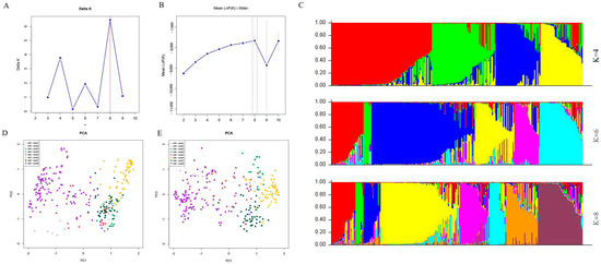 Genetics analysis of 32 candidate core markers in 280 eggplant materials. (A) The DK values corresponding to different K measurements. (B) The LnP(K) values corresponding to different K measurements. (C) Population structure analysis of 280 eggplant cultivars at K = 4, K = 6, and K = 8. (D) Principal component analysis by PC1 and PC2. (E) Principal component analysis by PC1 and PC3.
