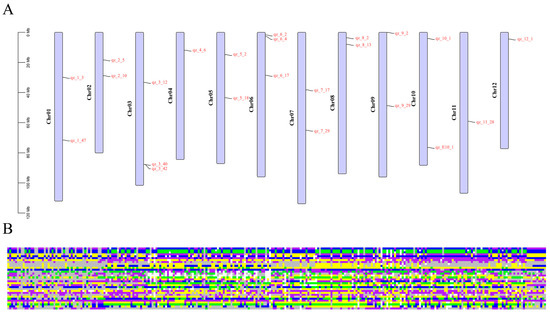 Distribution of 23 core markers and fingerprinting. (A) Distribution of 23 core markers on 12 chromosomes. (B) Fingerprints of the 280 eggplant materials. Each row represents a genome and each column represents a sample. Pure genotypes are AA = yellow, CC = green, GG = blue, TT = purple; heterozygous genotypes are gray; no call genotypes are NA = white.