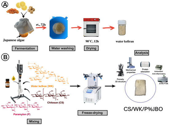 Graphic display of the main findings. Isolation of water kefiran (A) and scheme of obtaining CS/WK/P% sponges (B).