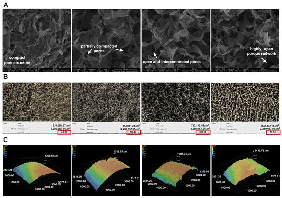 Morphology characterization of the obtained sponges. SEM images (A), porosity (B), and 3D profile (C).