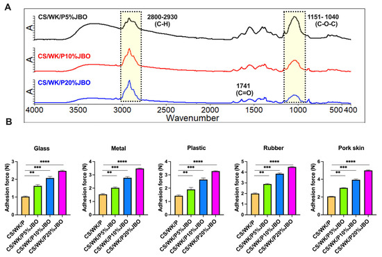 Characterization of the CS/WK/P%JBO sponges. ATR-FTIR spectra (A) and adhesion force (B). Statistical significance: p < 0.001 (**), p < 0.0001 (***), p < 0.00001 (****).